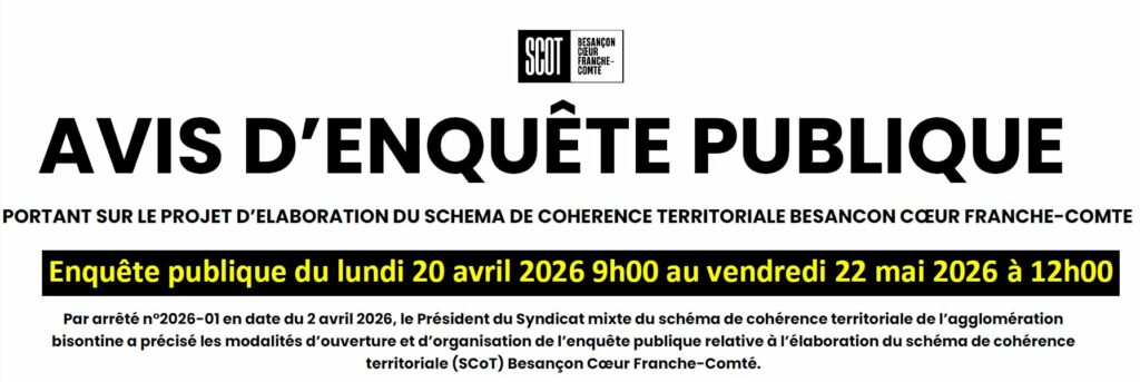 AVIS D’ENQUETE : https://www.scot.grandbesancon.fr/wp-content/uploads/2026/04/Avis-dEP_vblanche_ok.pdf